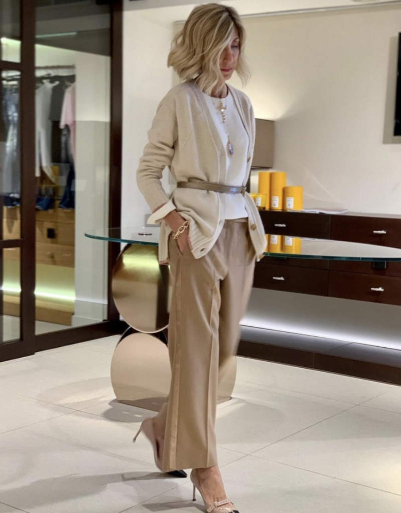 - Jos: Pantaloni largi, dar structurați, de culoarea cămilei.